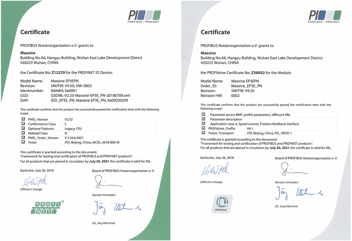 • PROFIBUS & PROFINET协会产品认证证书 颁发时间:2018年9月 颁发单位:中国PROFIBUS & PROFINET协会