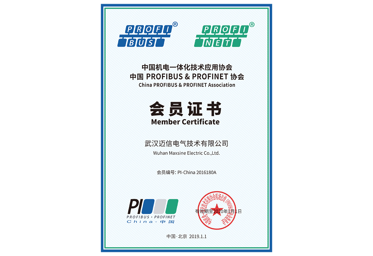 • 2020年度中国机电一体化技术应用单位、中国PROFIBUS&PROFINET协会 会员证书 颁发时间:2020年1月 颁发单位:中国PROFIBUS&PROFINET协会