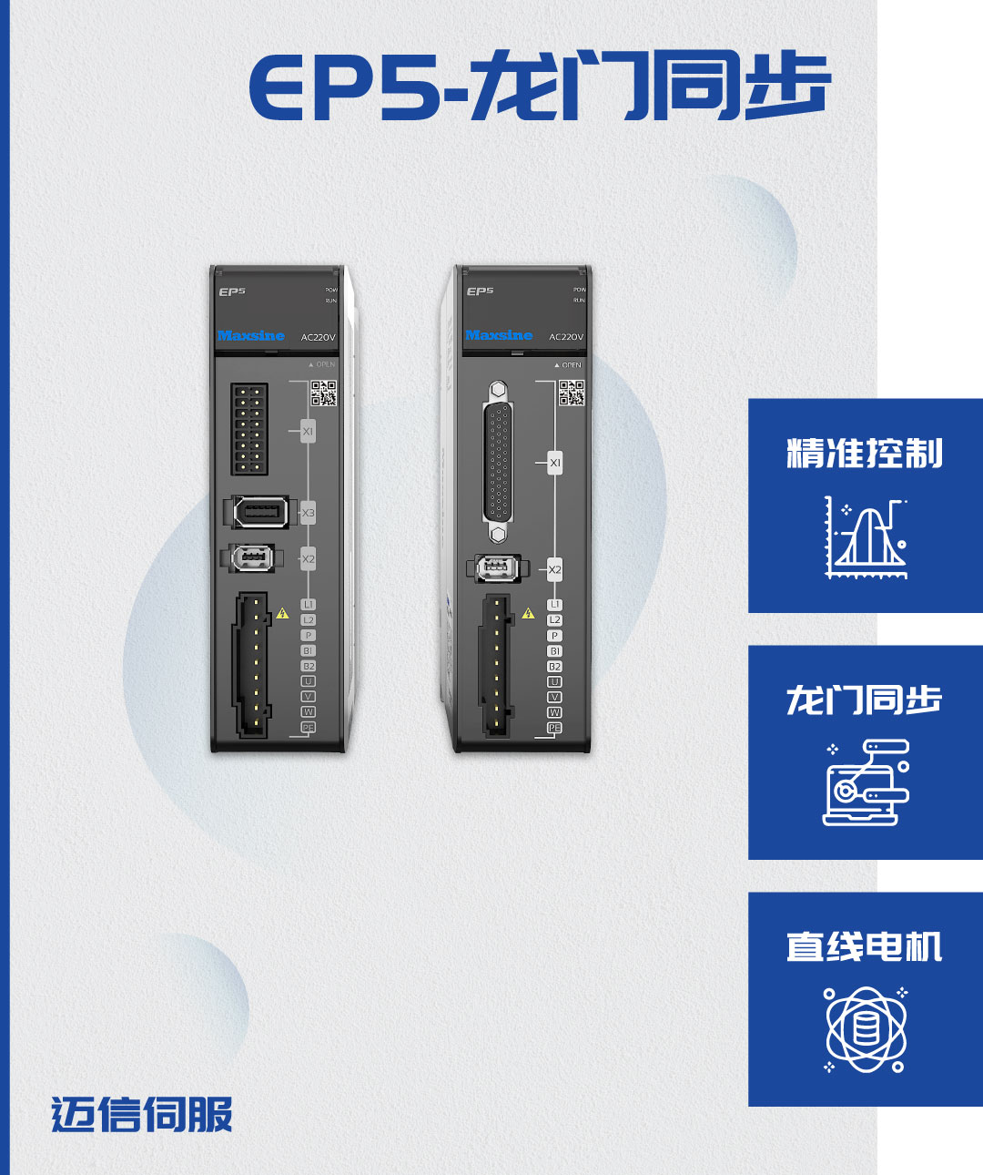 EP5系列产品全新升级,高性能的龙门同步功能,功能完备,实现精准控制,产品安全可靠并适配直线电机。EP5伺服主轴集异步/同步控制于一体,支持双编码器接口,窄体结构设计,更节省安装空间。