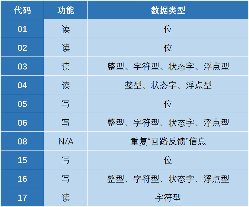 ModBus 功能码与数据类型对应表