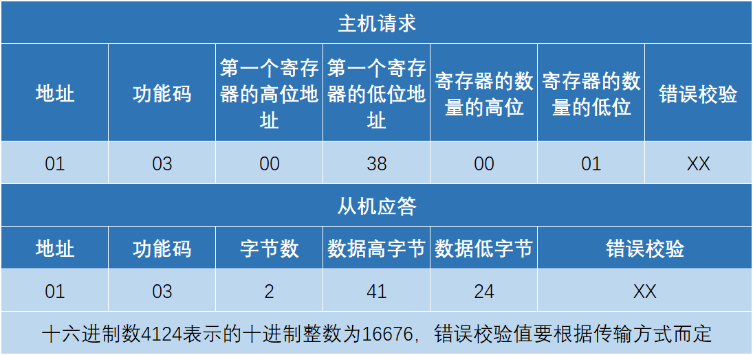 解析一下:主机发送指令,访问从站地址为1,使用功能码03(读保持寄存器),起始地址高8位、低8位:表示想读取的模拟量的起始地址(起始地址为0)。比如例子中的起始地址为38,十进制为:56。寄存器数量高8位、低8位:表示从起始地址开始读多少个模拟量。例子中为1个模拟量。注意,在返回的信息中一个模拟量需要返回两个字节。错误校验为CRC校验。