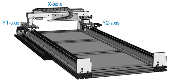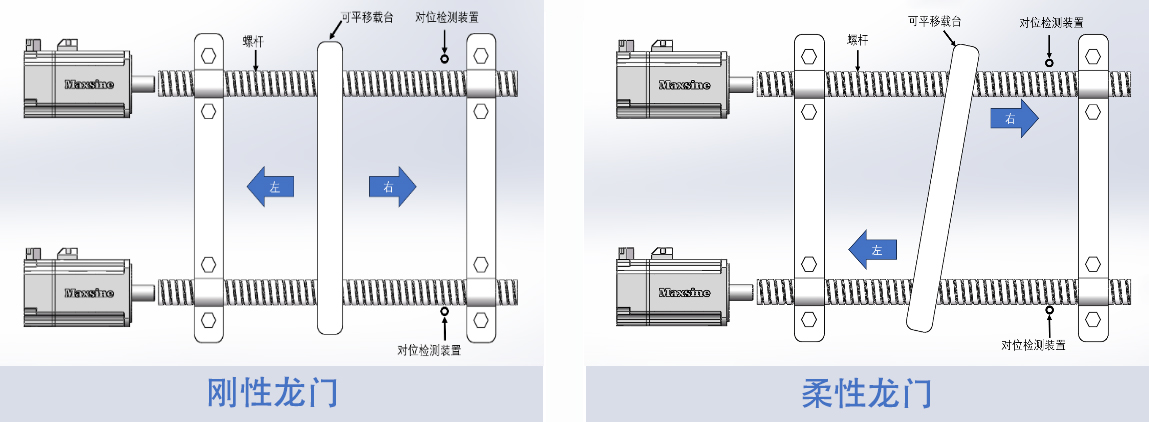 柔性龙门结构相对灵活可变性强,载台可在主从轴有较小位移的工况下同时移动,通常用于激光加工,3D打印等场景。