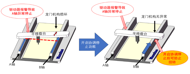 实时检测主从轴位置偏差,内置主从轴协调停机功能,当龙门运行中有轴出现报警时,主从轴同时段时能并自由停机,避免机构出现损坏。当出现警告时,主从轴可根据参数设定用户可选择主从轴报警时刻位置自锁还是均断使能自由停机。