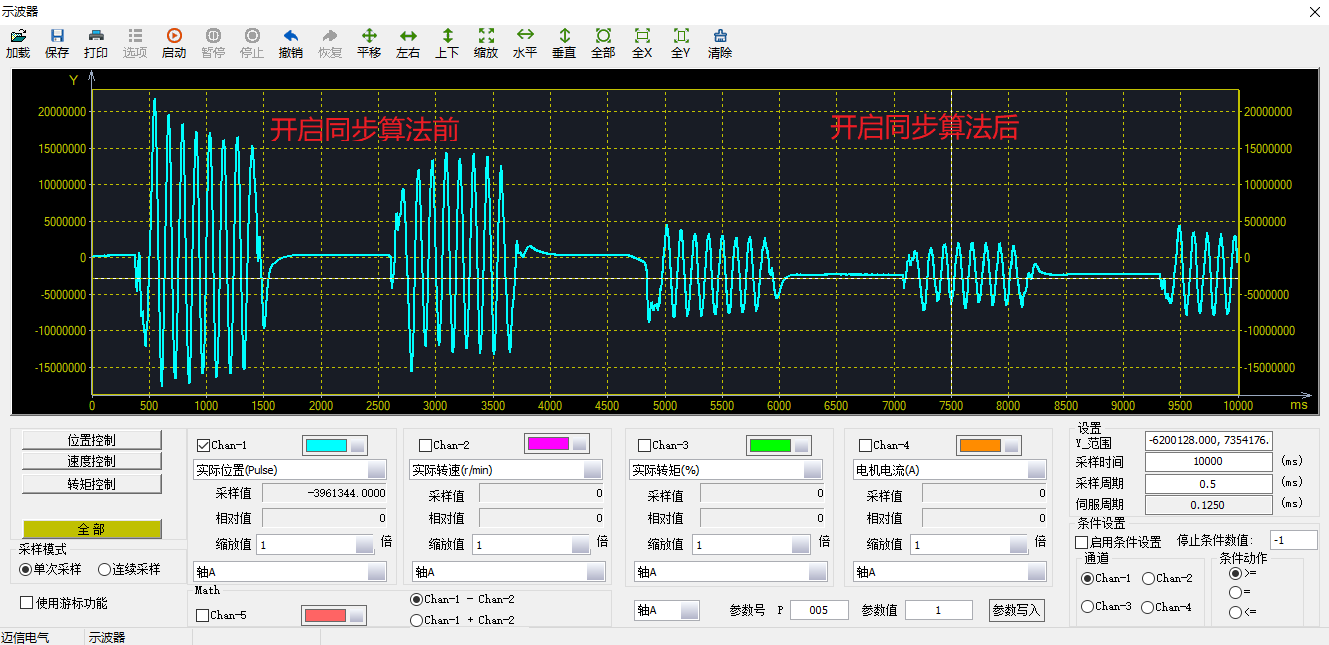 当开启龙门同步算法后通过示波器查看位置误差,在默认增益参数的情况下开启龙门同步算法后位置误差优化66%。