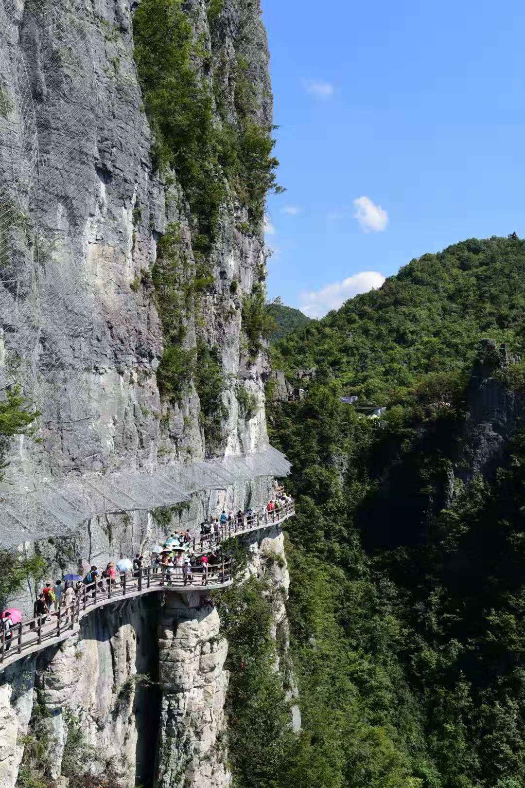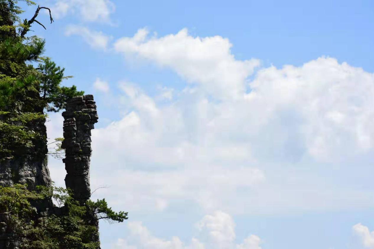 随着大巴车穿梭在险峻的山路中,几经颠簸后终于到达七星寨景区,进入景区的我们一下子就被穿梭在奇山怪石间的索道、盘绕在峥嵘峭壁上的绝壁栈道吸引了。无论是想乘坐索道直达山顶,还是想克服恐惧,攀登绝壁征服高山,欣赏沿路的山河美景,都可以感受到这嶙峋绝岭间壮观的景象,感叹大自然的鬼斧神工以及人类的匠心精神。华中科技大学著名的建筑与旅游专家张良皋教授认为恩施大峡谷是世界上最美丽的大峡谷,即使走马观花也令人如痴如醉,因为这里峡谷山峰险峻,山头高昂,有仰天长啸之浩气;谷底的清江水质清幽,令人有脱胎换骨之感受。沿着栈道一路攀爬,壮美无比的武陵风光如诗如画:错落有致的房屋、宛如玉带一样的河流、延绵百里的丛峰、蓝的清澈的天空以及充满仙气形态各异的云朵。该栈道共有七道弯八道拐,寓意是:路七弯八拐,心始终如一。歌曰:北斗七星有七斗,绝壁栈道有七抖;经过一番惊吓后,人生道路手拉手。山间的景色更是令人称绝,“一炷香”,高约150余米,最小直径只有4米,它风吹不倒,雨打不动,傲立群峰之中千万年,守护着这片神秘的土地,成了大峡谷中的镇谷之宝。黄山有“迎客松”,这里则有鞠躬松,也是大峡谷的五大奇观之一代表。这颗松代表我们好客的土家族、苗族人民向远方的游客深深地鞠个躬,既表示欢迎,又代表恭送。尽管山路崎岖,台阶时而陡峭,时而平坦,一路走来气喘吁吁,汗流浃背,腿脚酸疼,但沿途的美景和战胜自我的决心,让我们在恐惧和兴奋中爬完了七星寨景区的全程山路。