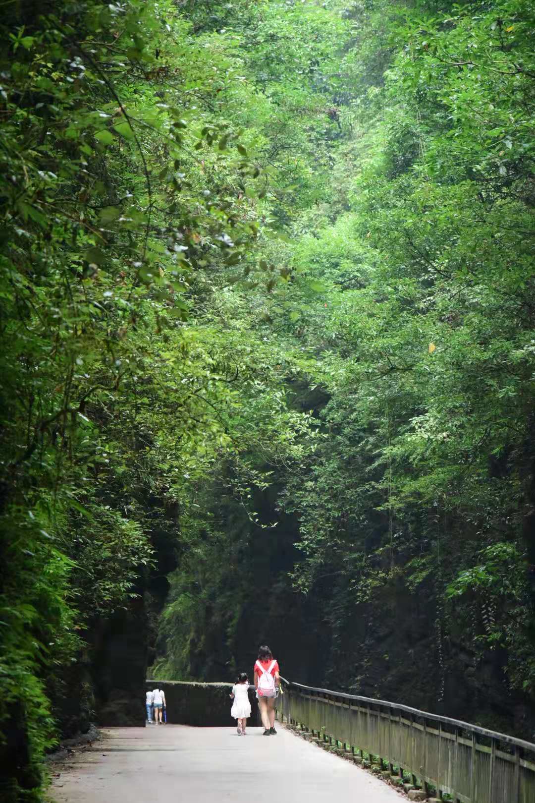匆匆吃过午饭,稍作休息后,我们在导游的带领下前往沐抚,游览“云龙河地缝”,这是大峡谷2013年新增景点。地缝至少形成于5千万年前,从地缝顶部到地缝底部的地层主要为形成于2.1-2.9亿年间、跨二迭与三迭纪的灰岩;全长3.6千米、平均深75米,平均宽15米,两岸陡峭,飞瀑狂泻,缝底流水潺潺,上通天水暗河,下联莽莽清江,成为恩施大峡谷一大奇观。游览地缝,最令大家惊叹的是山崖间飞泻而下的瀑布,以及山间陡峭的岩石台阶。正午阳光照射进来,虽然炎热,但山间瀑布流水带来的清凉以及山顶流下的潺潺溪水,冰冰凉的感觉瞬间赶走午后的燥热,让人无不流连忘返。