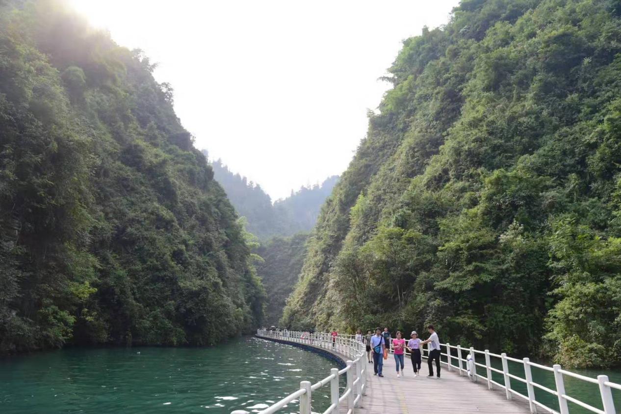 当太阳还没爬上枝头,我们在清晨的鸟儿叫声中早早起来,开始了第三天的旅程。尽管爬山过后,大家的腿都有些酸痛,但依然挡不住大家对“湖北最美漂浮桥”的心心向往。吃过丰盛的早餐,大家又兴趣盎然地随着导游前往“狮子山风景区”。因为在这里,我们可以见到被广大网友称为“湖北最美漂浮桥”的水上栈道,也称“廊桥遗梦”。“水上栈道”长约500米,宽4.5米,顺着蜿蜒的河道建设而成。当我们成群结队走在浮桥上面,两岸层峦叠翠,群峰莽莽,万树葱茏呈玉锦,铺红缀绿。林间鸟语花香,花丛蜂飞蝶舞,真叫人心旷神怡。行走在青山绿水间,无时不感受到土苗山乡大自然的魅力。当环保电瓶车沿着山路在水上急驰,溅起一阵阵地水浪时,那排山倒海地气势还是震惊了我们所有人。